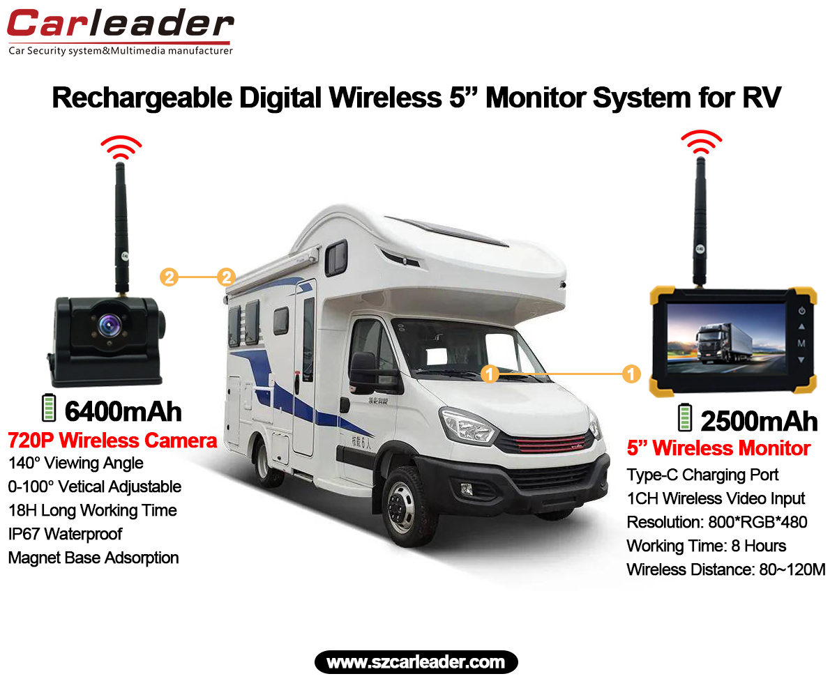 Carleader 5 인치 충전식 디지털 무선 모니터링 시스템최첨단입니다2.4G 디지털 무선 자동차 모니터링 시스템운전 안전과 편의성을 향상 시키도록 설계되었습니다. 고화질 5 ″ IPS 모니터와 다목적 무선 카메라를 결합한이 시스템은 다양한 환경에서 원활한 작동을위한 실시간 비디오 전송, 견고한 내구성 및 사용자 친화적 인 기능을 제공합니다.