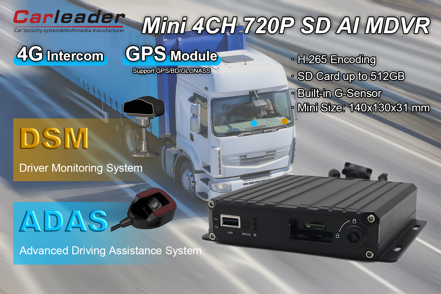 칼리더4CH AI 지능형 모바일 DVR(DSM 및 ADAS 카메라 포함) 상업용 차량, 대중 교통, 법 집행 차량, 개인 및 상업용 차량 안전 시스템에 사용하기에 이상적