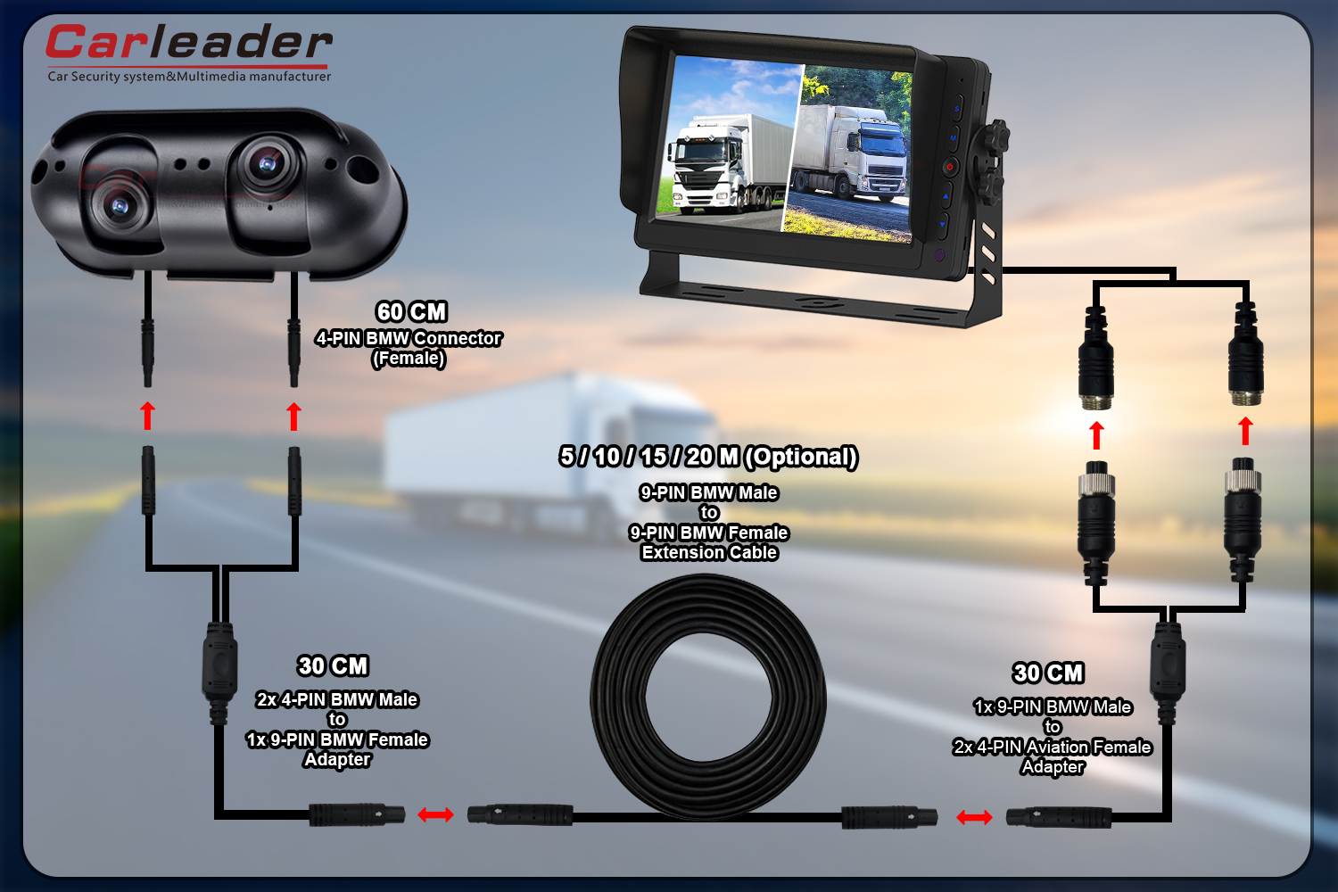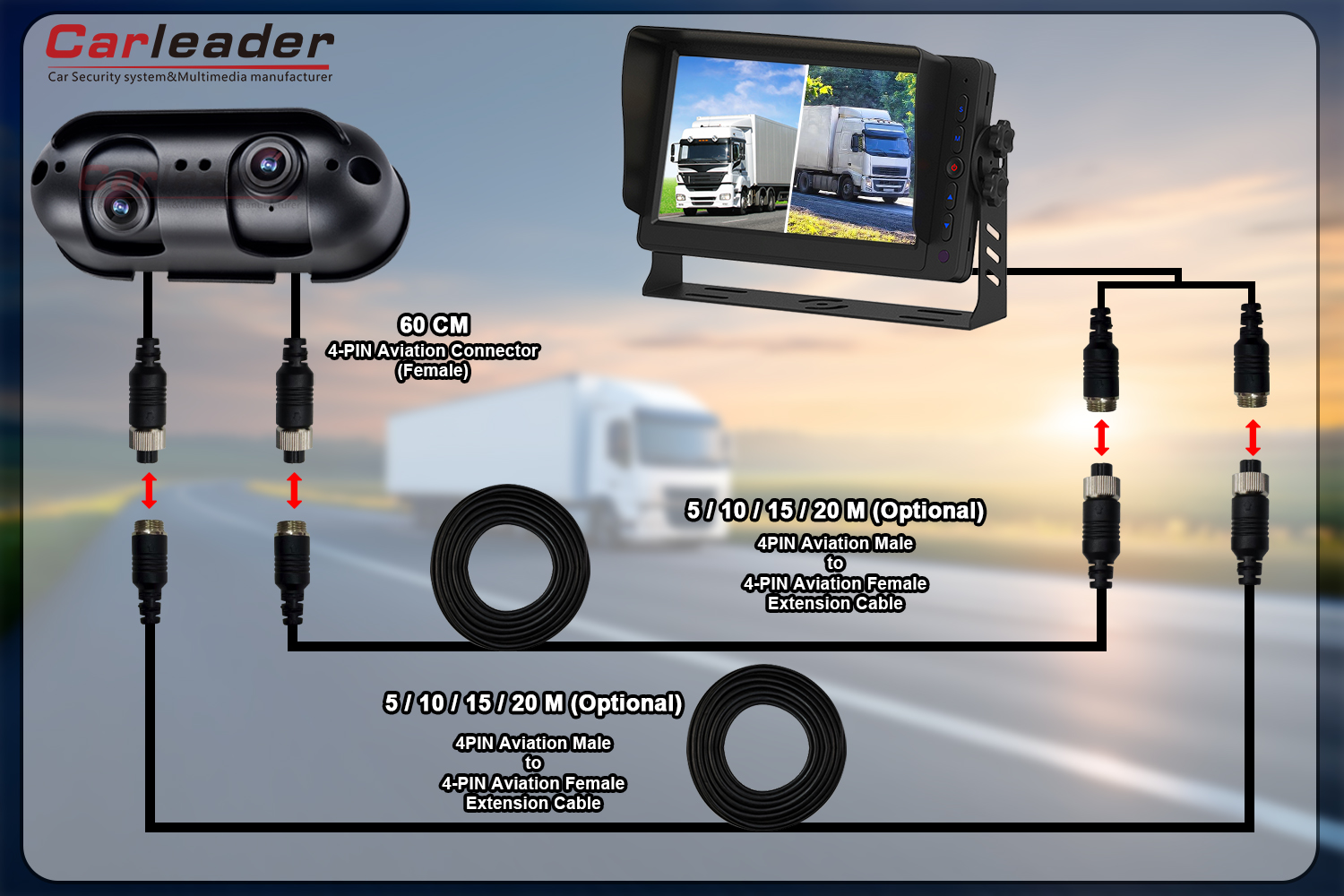 Carleader는 다양한 배선 요구 사항에 맞게 Starlight AHD 듀얼 렌즈 헤비듀티 후진 카메라용 두 가지 배선 솔루션을 제공합니다.