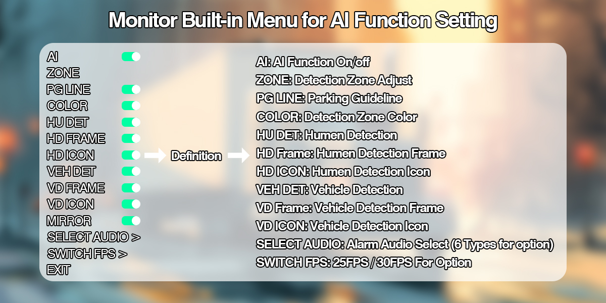 칼리더7인치 AI BSD 맹점 감지 모니터링 시스템 지원 AI 교정, 보행자 감지, 차량 감지, 운전 중 안전성 대폭 향상, AI 보정 메뉴가 내장된 모니터링, 감지 영역 조정, 감지 영역 색상 표시 켜기/끄기, 알람 오디오 유형, 차량 및 보행자 아이콘 표시, 감지 개체 선택 등을 지원하는 AI 카메라 솔루션입니다.