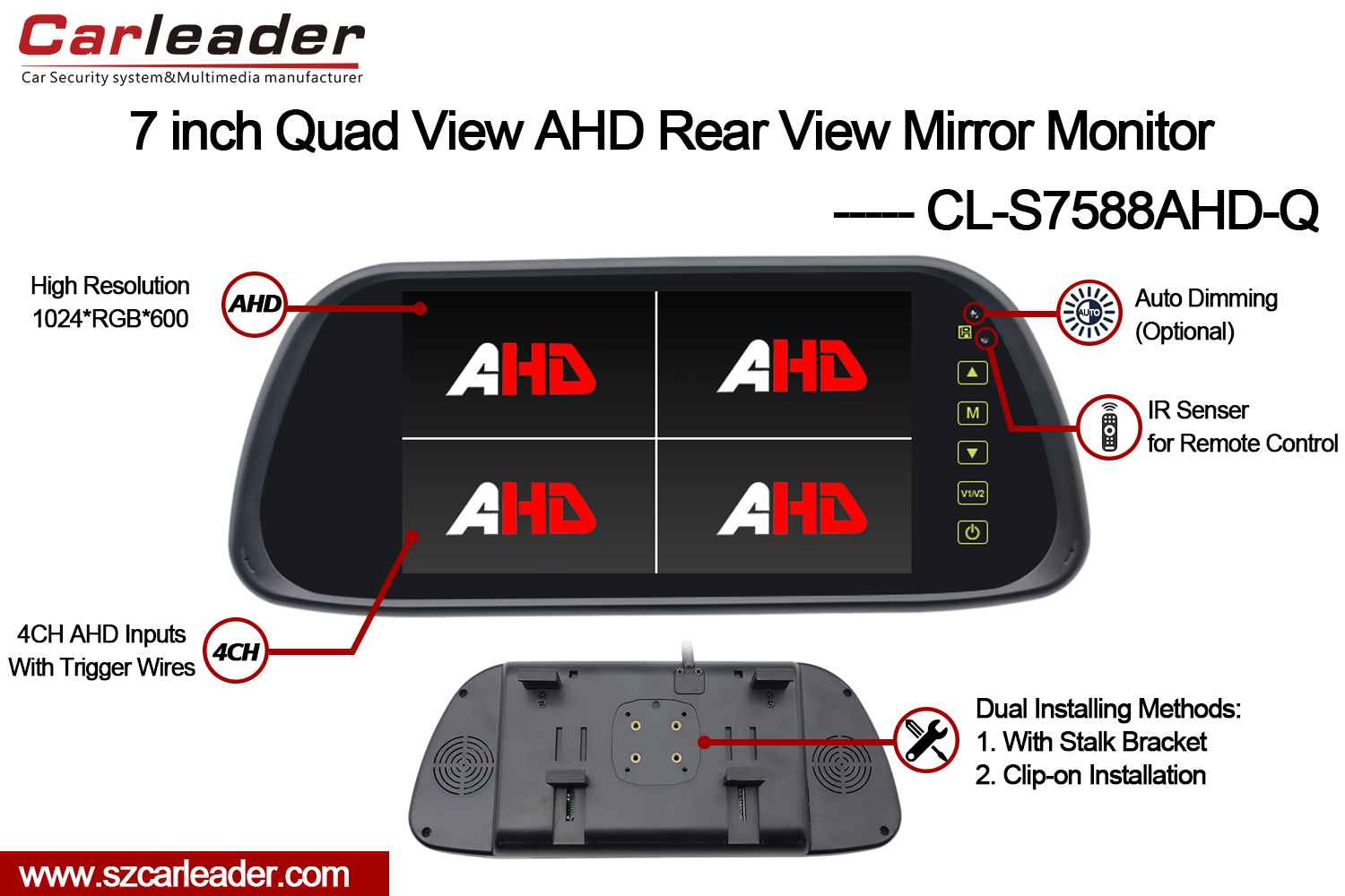 탁월한 선명도와 다양성을 경험해보세요.칼리더7인치 4CH 쿼드 AHD 백미러 모니터는 이중 설치를 지원합니다., 멀티 카메라 차량 시스템용으로 설계된 최첨단 7인치 쿼드 뷰 AHD 모니터입니다. 선택 가능한 설치 솔루션을 위한 2 in 1 설치 설계. 고급 AHD 기술이 적용된 이 모니터는 쿼드 디스플레이 4개 카메라 채널에 걸쳐 선명한 실시간 영상을 제공하여 최대한의 안전과 상황 인식을 보장합니다.