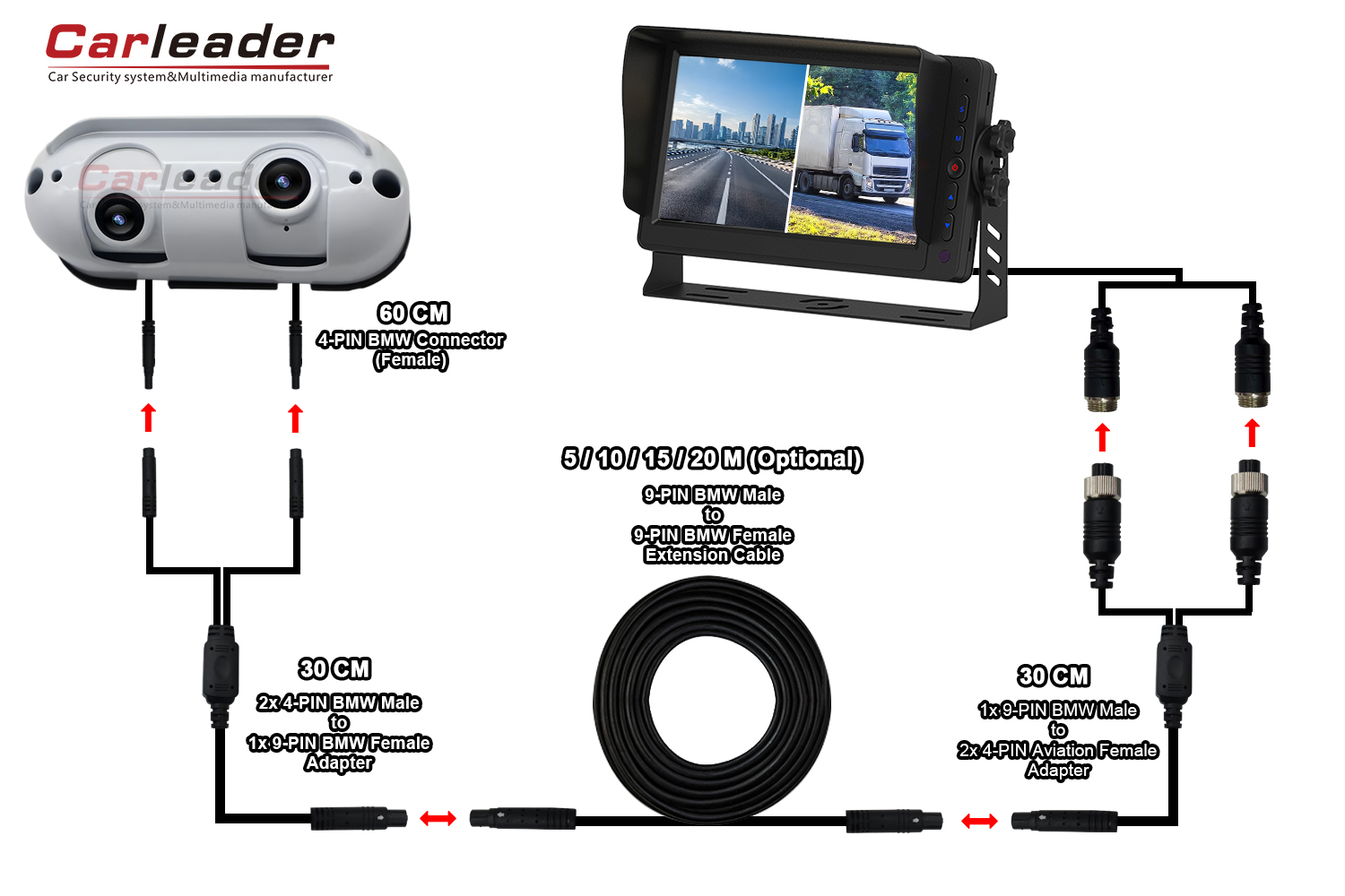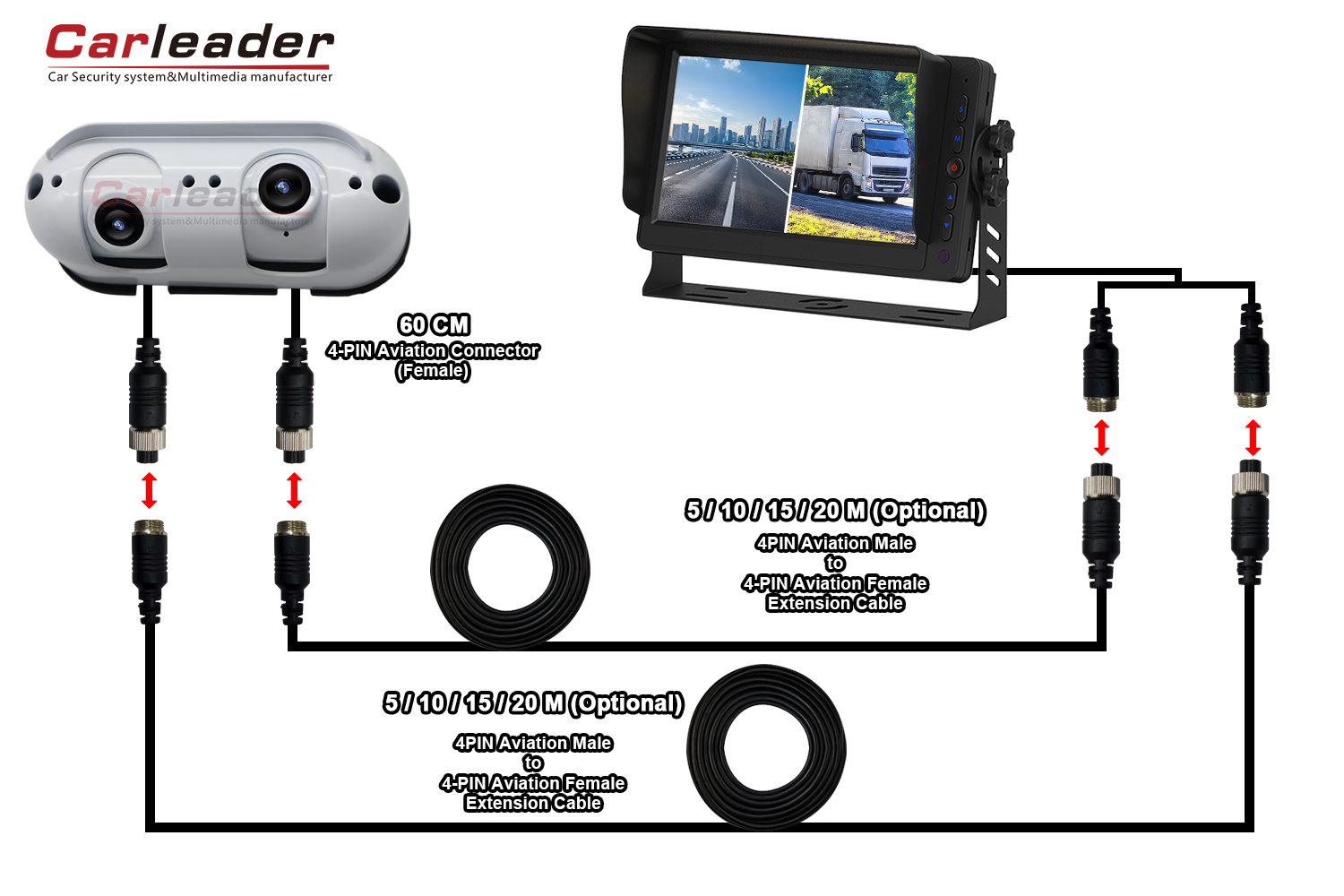 Carleader는 다양한 배선 요구 사항에 맞게 AHD Starlight 듀얼 렌즈 헤비 듀티 후방 카메라용 두 가지 배선 솔루션을 제공합니다.