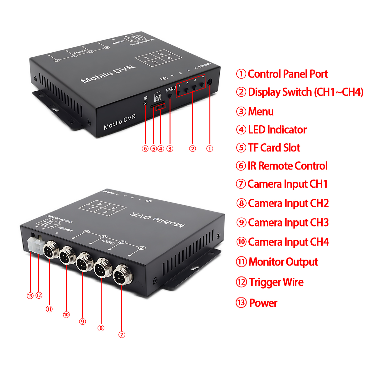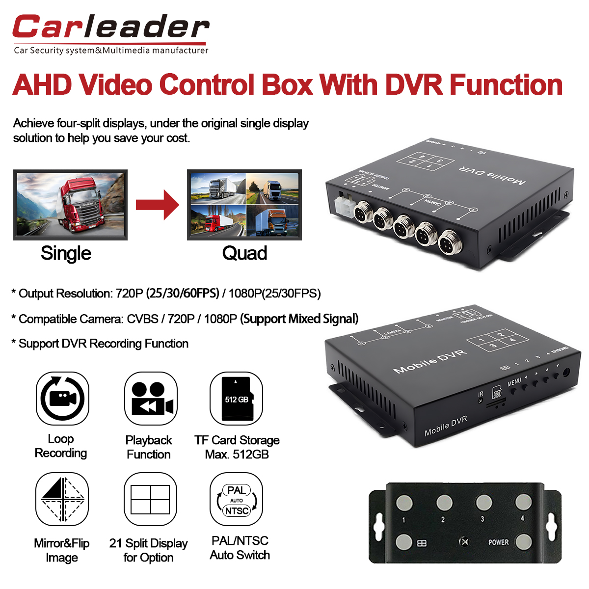 Carleader 쿼드 비디오 분배기 상자는 4CH 비디오 분배기 상자의 편리함과 DVR 녹화 기능의 보안을 결합합니다. 별도의 이미지 설정, 유연한 트리거 모드(트리거 와이어 및 원격 제어), 화면 가장자리 조정, 넓은 전압 입력 및 강력한 보호 기능을 포함한 포괄적인 기능 세트는 까다로운 모바일 환경에 적합한 안정적인 고품질 감시 솔루션을 제공합니다. Carleader 1080P AHD 쿼드 분할 디스플레이 비디오 프로세서 지원 비디오 녹화를 통해 완전한 상황 인식 및 보안 비디오 증거를 보장합니다..