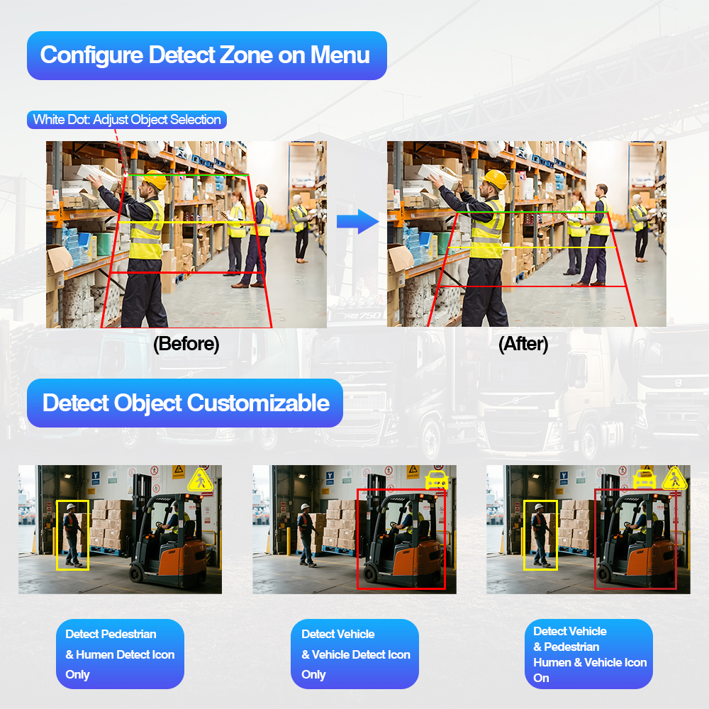 AI 기반 감지: 고급 AI 알고리즘은 보행자와 차량을 실시간으로 정확하게 식별하여 상업용 차량, 중장비 및 차량 운영에 대한 사전 안전을 보장합니다.