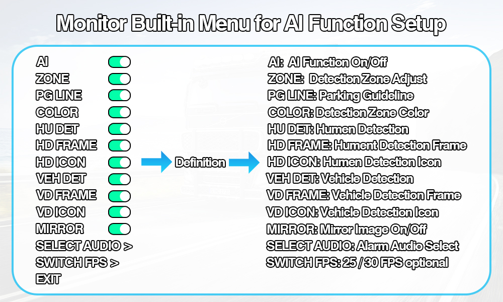 맞춤형 AI 보정: 모니터의 직관적인 화면 메뉴를 통해 AI 감지 영역을 쉽게 조정할 수 있으며 보행자만, 차량만 또는 둘 다 모니터링하도록 선택할 수 있습니다. 명확한 시각적 피드백을 위해 온/오프 선택 가능한 감지 프레임 및 객체 아이콘(보행자 또는 차량) 오버레이를 사용합니다.